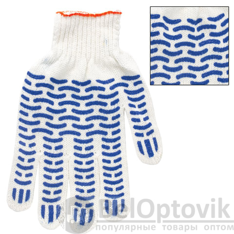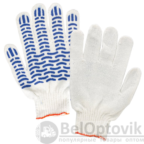Изготовлены из хлопчатобумажной пряжи плотностью 166 текс с покрытием из поливинилхлорида с нанесением рисунка на внутреннюю сторону перчатки. Покрытие ПВХ помогает обеспечить плотный захват и предотвращает соскальзывание детали. Резинки на манжетах обеспечивают плотное прилегание перчатки к руке. Перчатки белого цвета имеют 7,5 класс вязки. Вес пары - 46-48 г. Поставляются в комплекте 5 штук в полиэтиленовой упаковке.