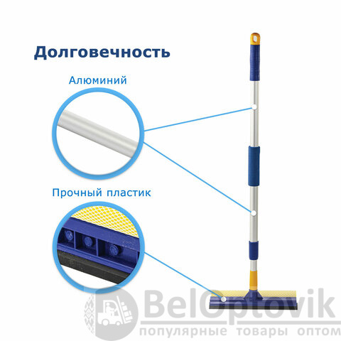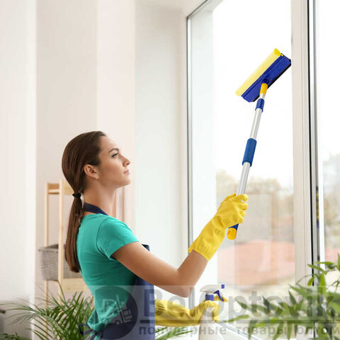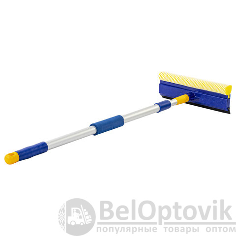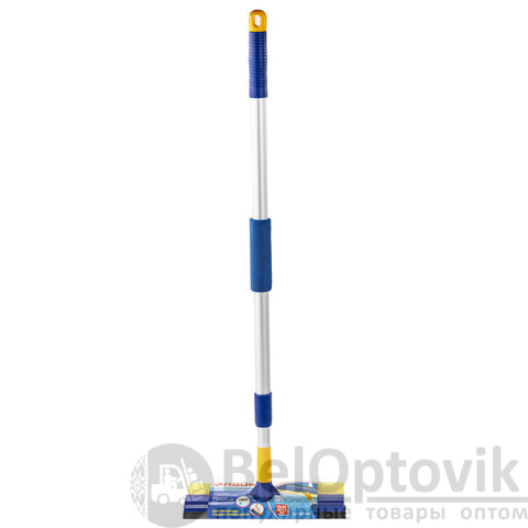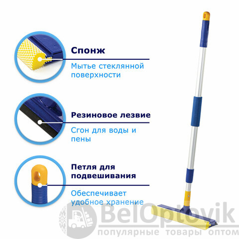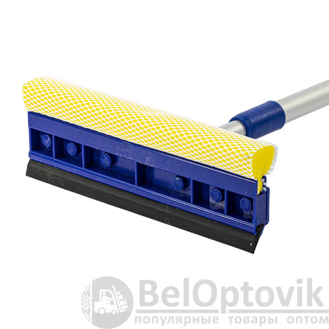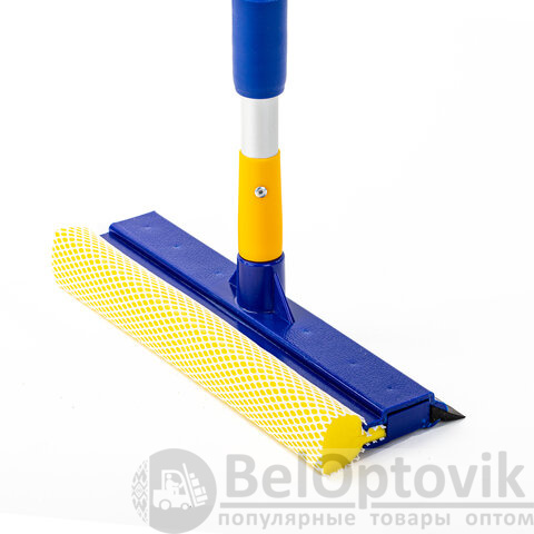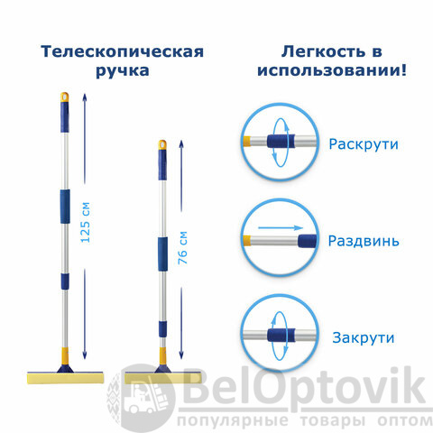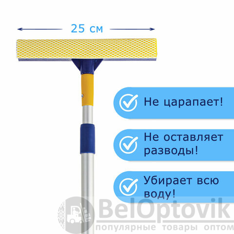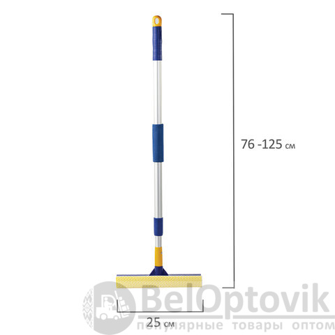 Выполняет две функции: мытье стеклянной поверхности с помощью спонжа и сгон воды резиновым лезвием. Телескопическая ручка упрощает уборку. Ручка выполнена из алюминия. Длина телескопической ручки - 76-125 см. Ширина рабочей части - 25 см.
