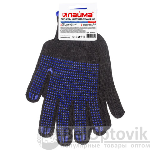 Перчатки хлопчатобумажные, 1 ПАРА, 7 класс, 70 г, 233 текс, ПВХ точка, LAIMA ПРЕМИУМ, европодвес, ЧЕРНЫЕ, 603581