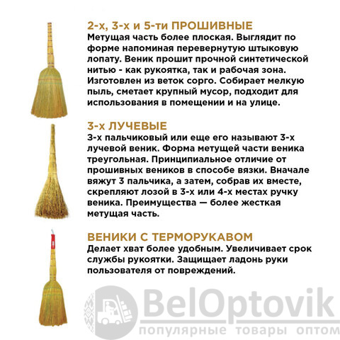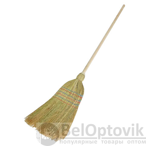 Изготовлен из 100% сорго с деревянным черенком. Веник пяти-прошивной, прошитый синтетической нитью повышенной прочности. Размеры: