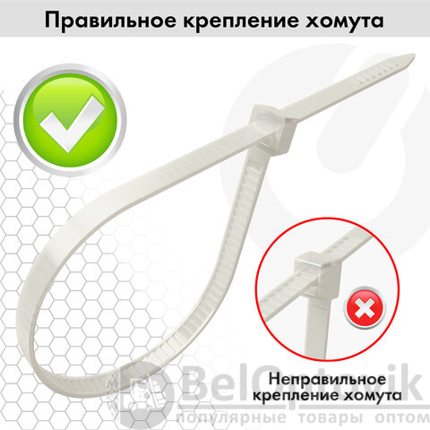 В нашем ассортименте представлены стяжки (хомуты) различные по длине (от 100 до 300 мм) и ширине (2,5 и 3,6 мм). Также в наличии имеются стяжки (хомуты) белые, черные и цветные.
