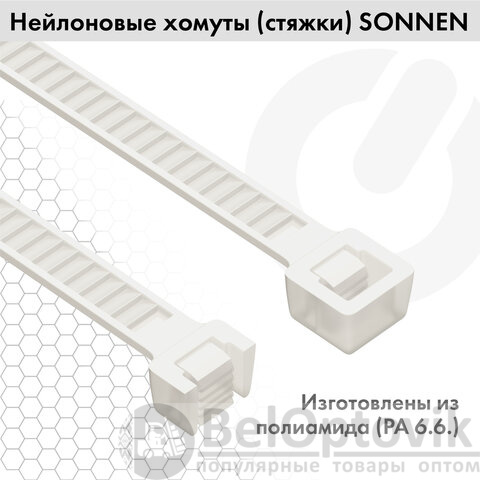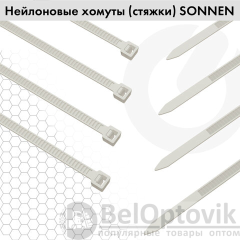 Стяжки (хомуты) нейлоновые SONNEN используются при проведении электромонтажных работ для крепления кабелей, проводов и других предметов к несущей поверхности или для соединения между собой. Такие стяжки также используются для бытовых и хозяйственных нужд.