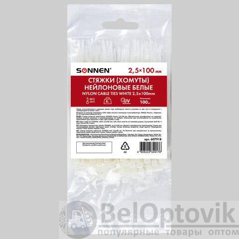 Стяжки (хомуты) нейлоновые SONNEN обеспечивают надежное, быстрое и экономичное крепление. Они просты и удобны в использовании: большим пальцем левой руки прижмите замок к пучку, а правой рукой затяните петлю, вставьте конец затяжки в замок и затяните до полной фиксации, после чего отрежьте выступающую часть бандажа. Не рекомендуется перегибать бандаж при затяжке.