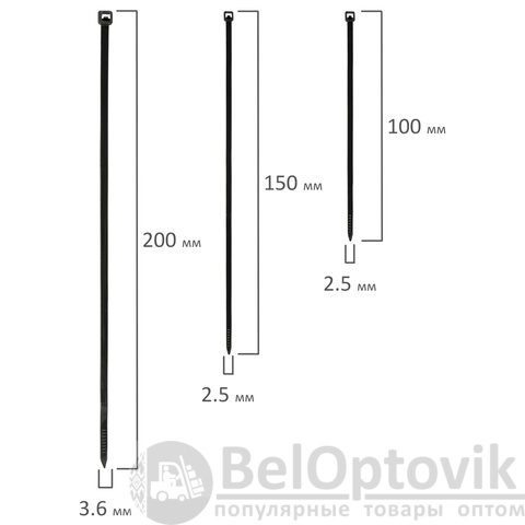 В нашем ассортименте представлены стяжки (хомуты) различные по длине (от 100 до 300 мм) и ширине (2.5 и 3,6 мм). Также в наличии имеются стяжки (хомуты) белые, черные и цветные.