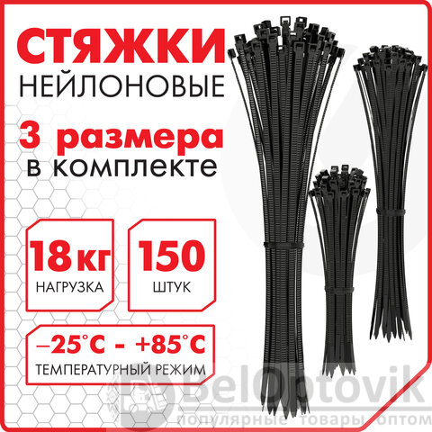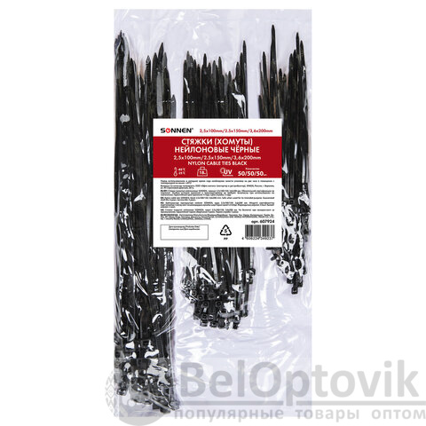 Стяжки (хомуты) нейлоновые сверхпрочные НАБОР 150 шт. (2,5х100/150 мм; 3,6х200 мм), черные, SONNEN, 607924