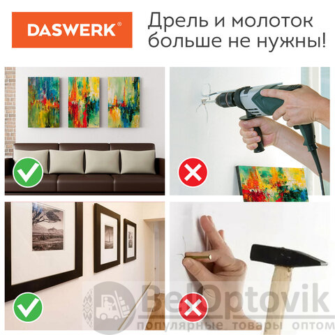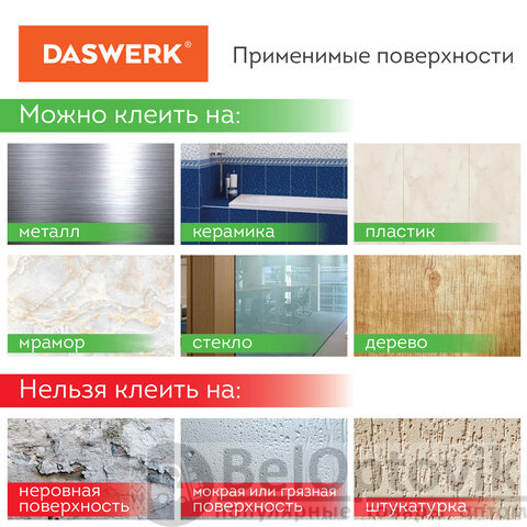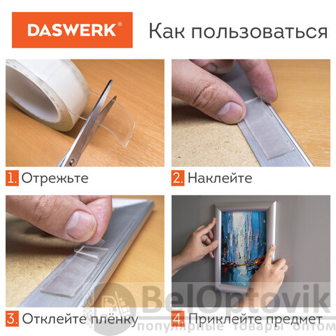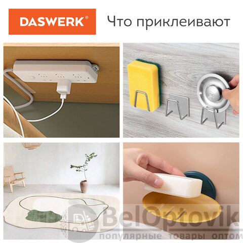 Многоразовая двухсторонняя крепежная лента DASWERK применяется для временной фиксации предметов и крепежа к различным типам поверхностей, в том числе прозрачным.