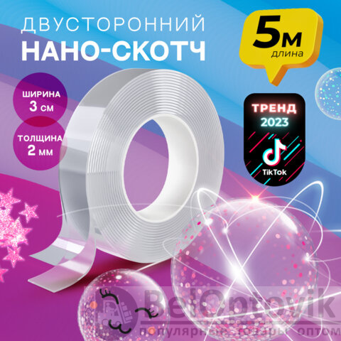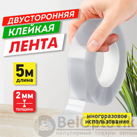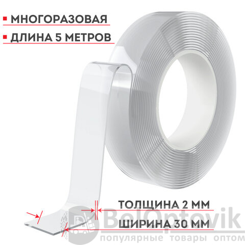Многоразовая двухсторонняя прозрачная крепежная лента "Скотч NANO tape 5 м х 30 мм", 2 мм, DASWERK, 607929
