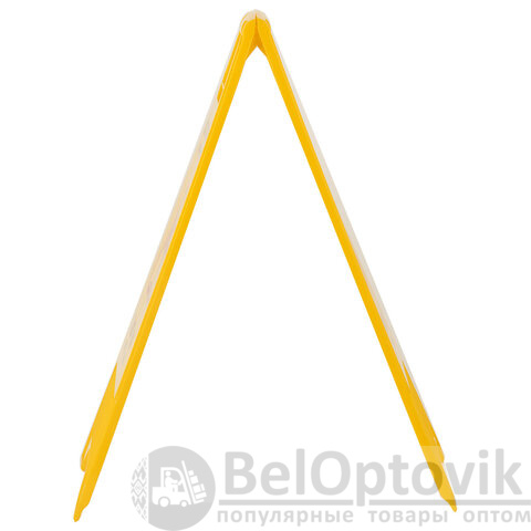 Знак выполнен из ударопрочного пластика, легко складывается и раскладывается. В сложенном виде имеет размер 62х30 см. Информация написана на русском и английском языках. Яркий желтый цвет позволяет увидеть знак на большом расстоянии.
