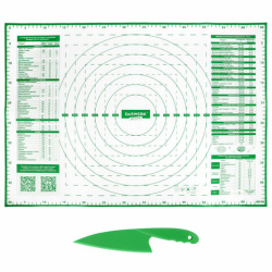 В первую очередь коврик силиконовый предназначен для замешивания и раскатки теста, но готовить на нём можно любые блюда. Изготовленный из безопасного пищевого силикона коврик размером 46х66 см не скользит по столу, а тесто любой консистенции к коврику не прилипает. Для удобства на силиконовый коврик для теста нанесена вспомогательная разметка и полезная кулинарная информация. Также набор включает пластиковый нож для теста (24 см).