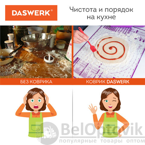 Силиконовый коврик DASWERK - это многофункциональная кухонная принадлежность, необходимая каждой хозяйке. Коврик облегчает процесс приготовления и помогает сохранить чистоту и порядок на кухне.