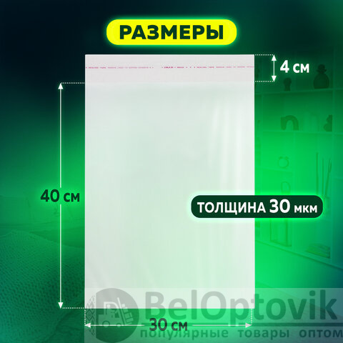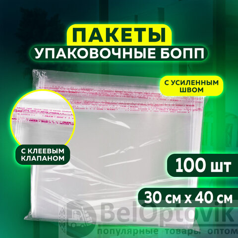 Пакет БОПП с клеевым клапаном, КОМПЛЕКТ 100 шт., 30х40+4 см, толщина 30 мкм, с усиленным швом