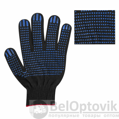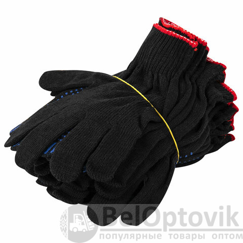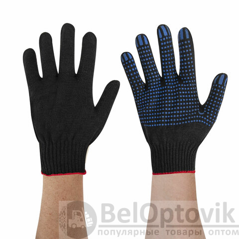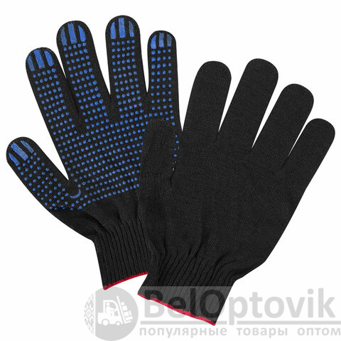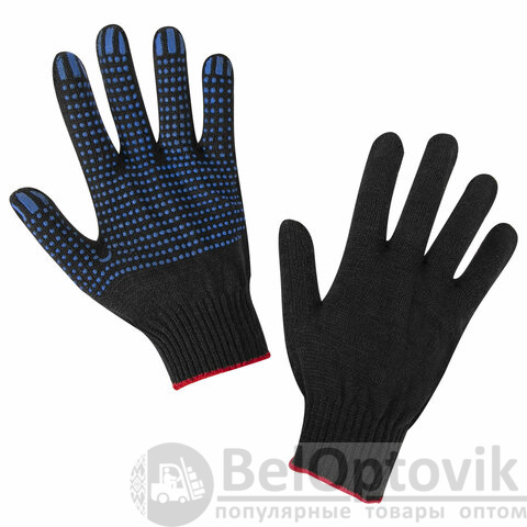 Изготовлены из хлопчатобумажной пряжи плотностью 116 текс с покрытием из поливинилхлорида с нанесением рисунка на внутреннюю сторону перчатки. Покрытие ПВХ помогает обеспечить плотный захват и предотвращает соскальзывание детали. Резинки на манжетах обеспечивают плотное прилегание перчатки к руке. Перчатки черного цвета имеют 10 класс вязки. Вес пары - 40-42 г. Поставляются в комплекте 100 штук в полиэтиленовой упаковке.