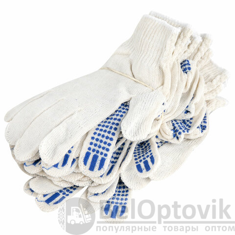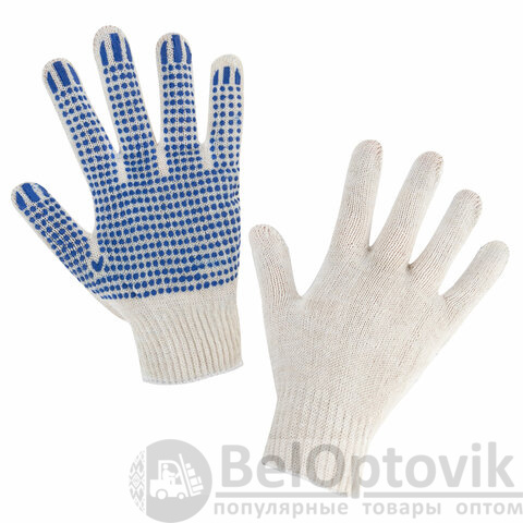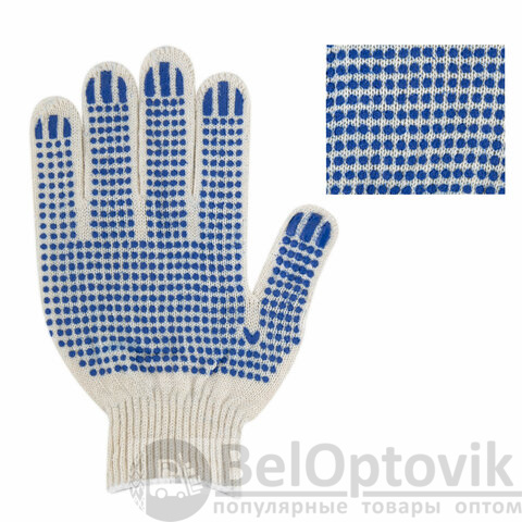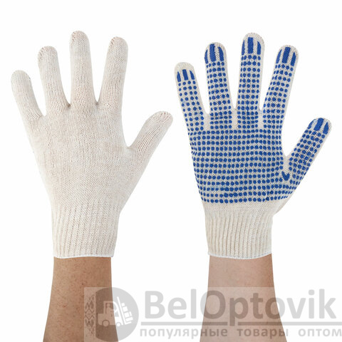 Изготовлены из хлопчатобумажной пряжи плотностью 83 текс с покрытием из поливинилхлорида с нанесением рисунка на внутреннюю сторону перчатки. Покрытие ПВХ помогает обеспечить плотный захват и предотвращает соскальзывание детали. Резинки на манжетах обеспечивают плотное прилегание перчатки к руке. Перчатки белого цвета имеют 10 класс вязки. Вес пары - 32-34 г. Поставляются в комплекте 100 штук в полиэтиленовой упаковке.