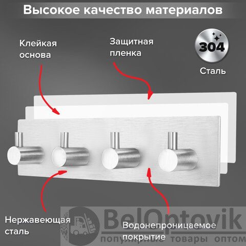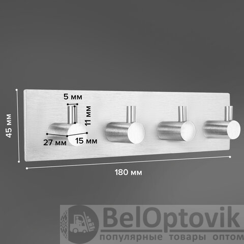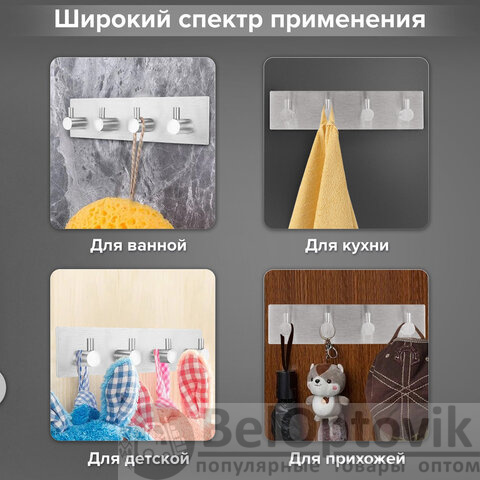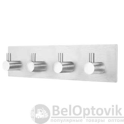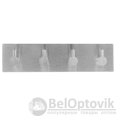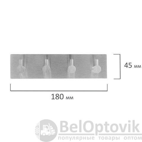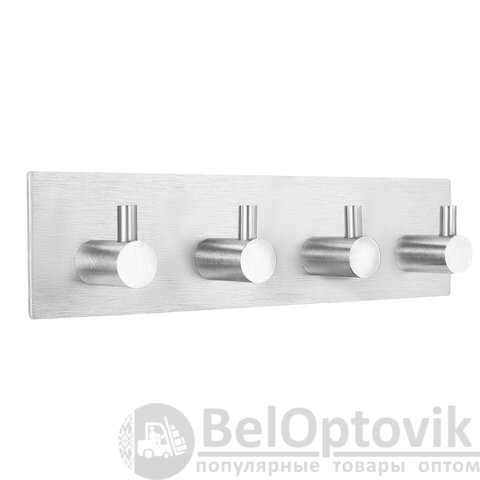 Крючки в количестве 4-х штук на общей планке, размер основания - 18 x 4,5 см. Цвет - серебристый. Выдерживают вес до 50 кг.