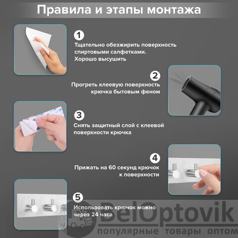 Для крепления крючка просто следуйте инструкции, приведенной на упаковке: 1) тщательно обезжирьте и высушите поверхность, на которой предполагается использовать крючок; 2) прогрейте клеевую поверхность крючка бытовым феном; 3) снимите защитный слой с клеевой поверхности крючка; 4) крепко прижимайте крючок к стене в течение 60 секунд; 5) используйте крючок через 24 часа после приклеивания.