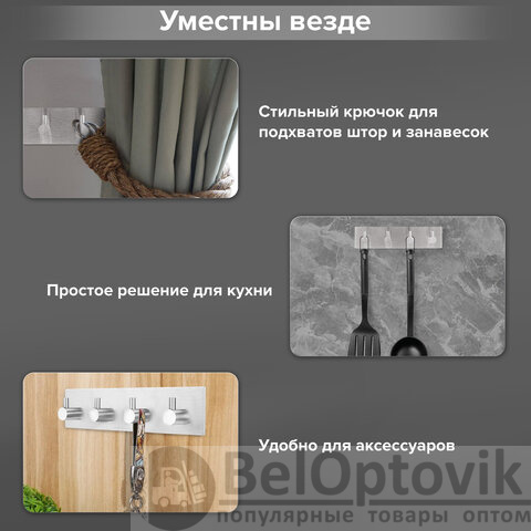 Крючки самоклеящиеся широкого спектра применения подойдут для использования в любом месте вашего дома: в спальне, прихожей, на кухне, в ванной и туалете. Универсальные держатели сделают хранение вещей проще и удобнее. На них можно вешать халаты, полотенца, фены, мочалки и другие принадлежности в ванной и душе; фартуки, прихватки, мочалки - на кухне; ключи, сумки и верхнюю одежду - в прихожей. Их можно использовать как дополнительные крючки в шкафу, они также подойдут в качестве подхватов для штор. Их легко приклеить и при желании можно удалить.