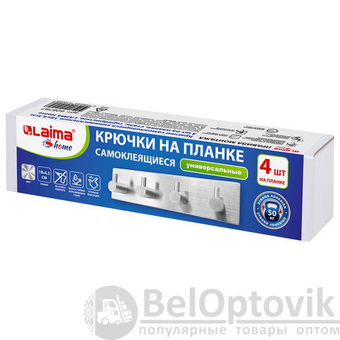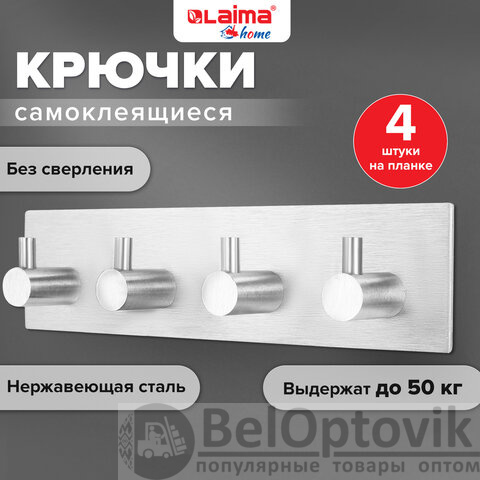 Крючки самоклеящиеся универсальные 18х4,5 см, 4 шт. на планке, сталь, серебристые, LAIMA Home, 608787