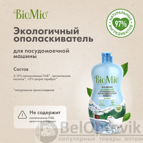 Экологичный ополаскиватель для посудомоечной машины BIOMIO BIO-RINSE повышает эффективность мытья посуды, предотвращая образование на её поверхности разводов, подтеков и налета. Придает ослепительный блеск стеклу и столовым приборам.