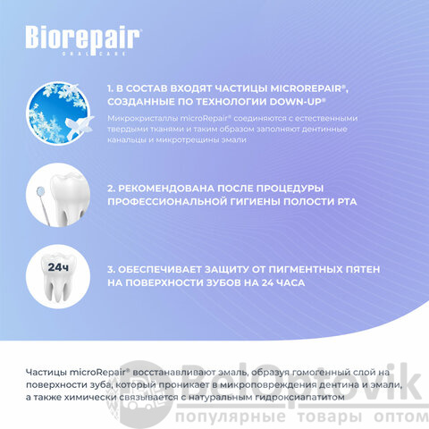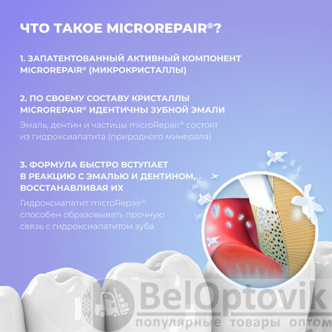 Восстанавливает эмаль при помощи уникальных частиц microRepair. Их состав идентичен природному гидроксиапатиту, из которого состоят эмаль и дентин.