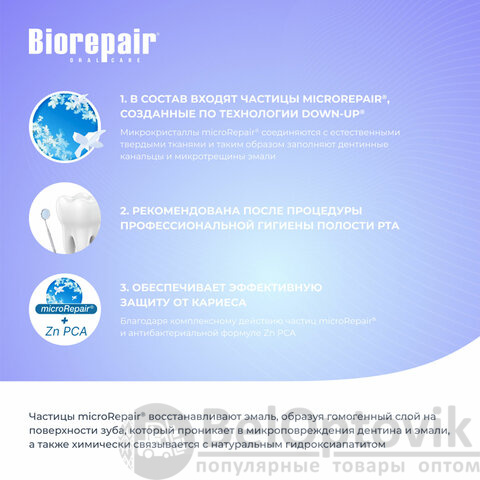 Восстанавливает эмаль при помощи уникальных частиц microRepair. Их состав идентичен природному гидроксиапатиту, из которого состоят эмаль и дентин.