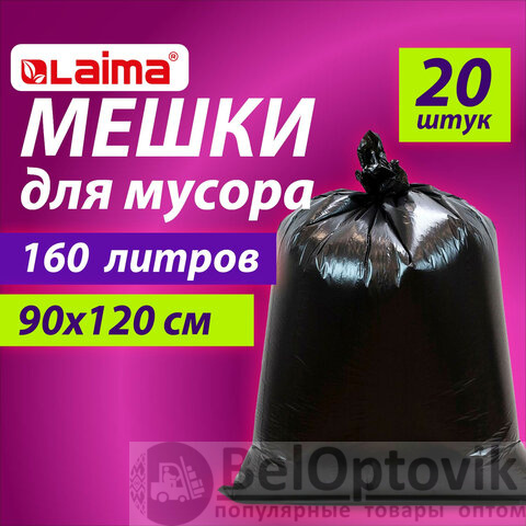 Мешки для мусора 160 л, черные, в пачке 20 шт., особо прочные, ПВД 50 мкм, 90х120 см, LAIMA