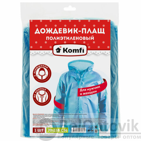 Дождевик-плащ синий на кнопках полиэтиленовый, универсальный размер 118x70 см, Komfi
