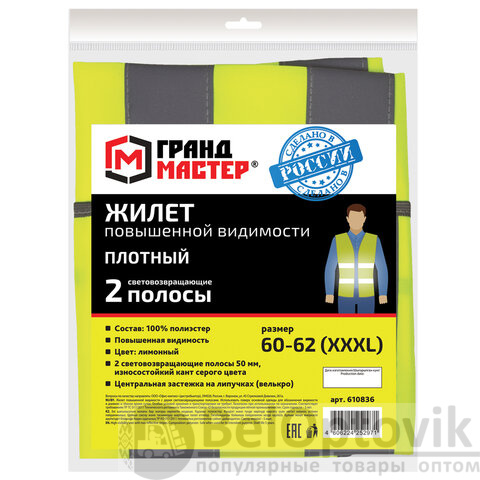 Жилет сигнальный ГОСТ, 2 светоотражающие полосы, ЛИМОННЫЙ, XXXL (60-62), ПЛОТНЫЙ, ГРАНДМАСТЕР, 610836