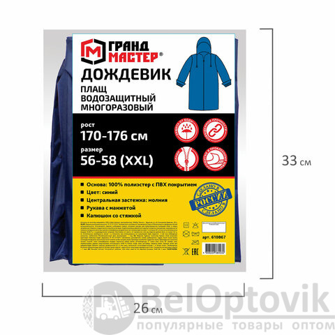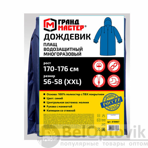 Многоразовый плащ-дождевик на молнии с ПВХ-покрытием ГРАНДМАСТЕР предназначен для защиты от ветра, дождя и других атмосферных воздействий. Идеально подойдет для работы на улице, отдыха на природе, рыбалки, пикника и городских прогулок.
