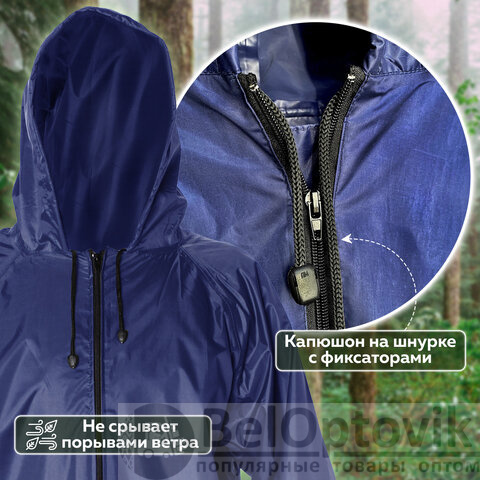 Ветрозащитная планка, рукав реглан с приточной манжетой. В нижней части пройм расположены два вентиляционных отверстия, оформленные люверсами. Низ изделия обработан в подгиб. Внешний край капюшона собран на кулису, в которую вставлен шнур с наконечниками и фиксаторами. Ткань таффета из полиэстера обладает хорошими ветрозащитными и влагозащитными свойствами, не промокает и не растягивается при намокании, устойчива к ультрафиолетовому излучению.