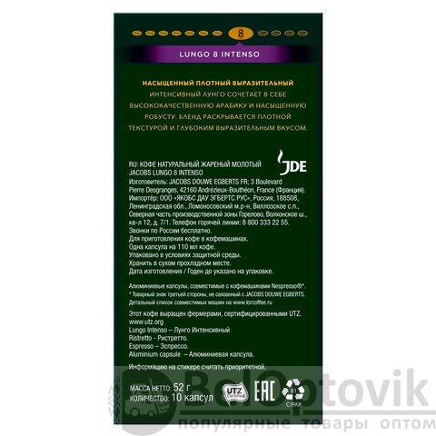 Яркий, пряный, интенсивный кофе в алюминиевых капсулах JACOBS "Lungo 8 Intenso".