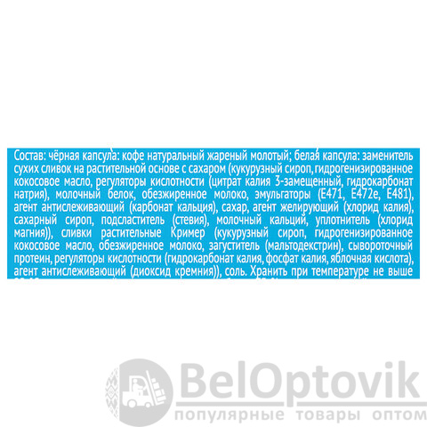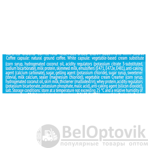 Состав: кофе жареный молотый, заменитель сливок на растительной основе (кукурузный сироп, гидрогенизированное кокосовое масло, регуляторы кислотности (цитрат калия 3-замещенный, гидрокарбонат натрия), молочный белок, обезжиренное молоко, эмульгаторы (E471, E472e, E481), агент антислеживающий (карбонат кальция), сахар, агент желирующий (хлорид калия), сахарный сироп, подсластитель (стевия), молочный кальций, уплотнитель (хлорид магния)), сливки растительные "Кример" (кукурузный сироп, гидрогенизированное кокосовое масло, обезжиренное молоко, загуститель (мальтодекстрин), сывороточный протеин, регуляторы кислотности (гидрокарбонат калия, фосфат калия, яблочная кислота), агент антислеживающий (диоксид кремния)), ароматизатор.