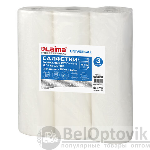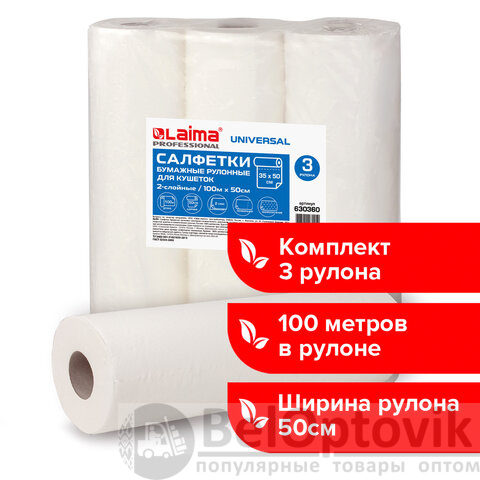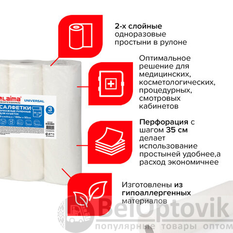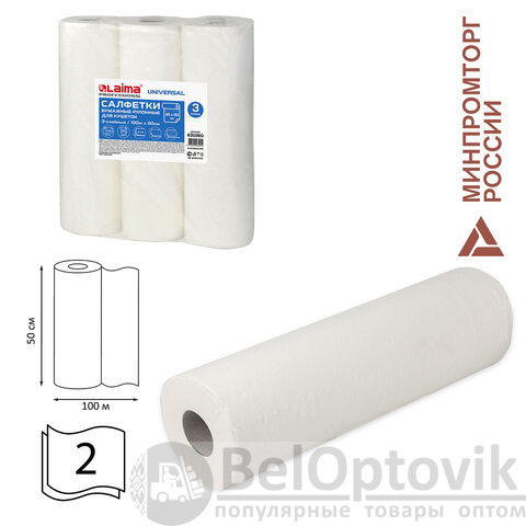 Простыни бумажные рулонные с перфорацией LAIMA UNIVERSAL КОМПЛЕКТ 3 шт., 2-слойные, 0,5х100 м, 17+17 г/м2, 630360, БС-2-ПР/100