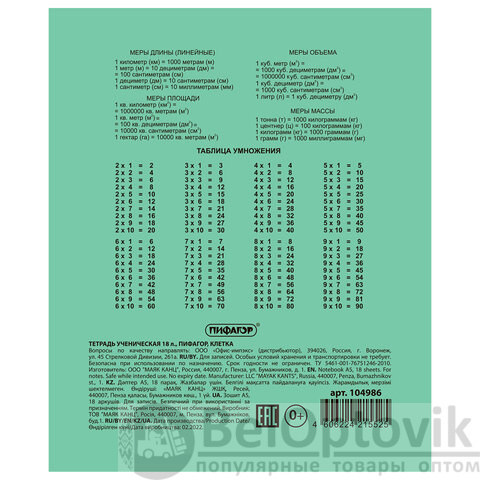 Тетрадь ПИФАГОР с классической зеленой обложкой подойдет для занятий школьнику преимущественно начальных и средних классов. На обороте представлена дополнительная информация.