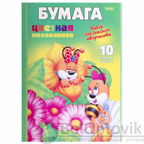 Цветная бумага А4 мелованная, 10листов 10 цветов, папка, HATBER ECO, "Пчелки", 195х280 мм, 10Бц4м_00206