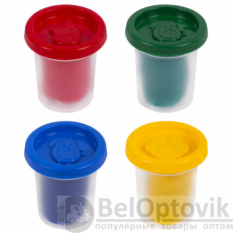 Пластилин-тесто для лепки BRAUBERG KIDS, 4 цвета, 200 г, яркие классические цвета, крышки-штампики, 106714