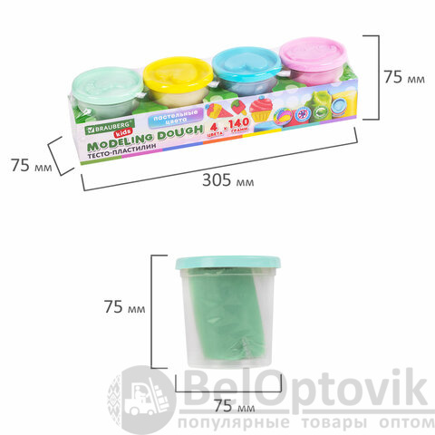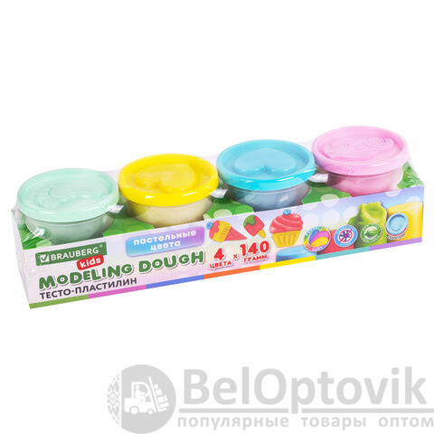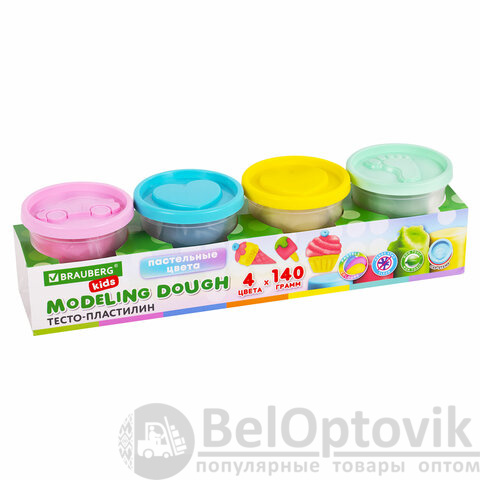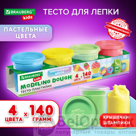Пластилин-тесто для лепки BRAUBERG KIDS, 4 цвета, 560 г, пастельные цвета, крышки-штампики, 106717