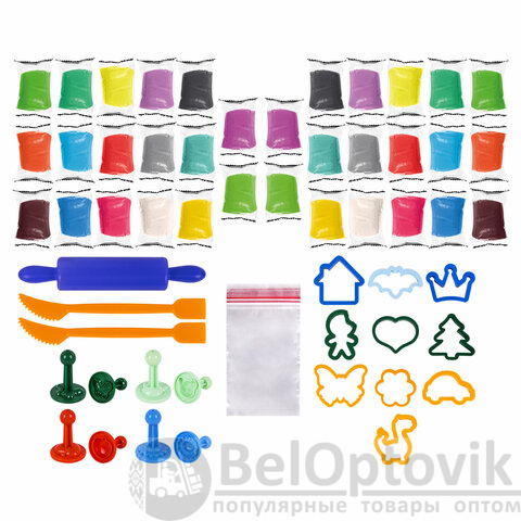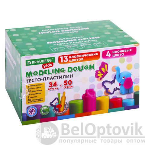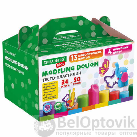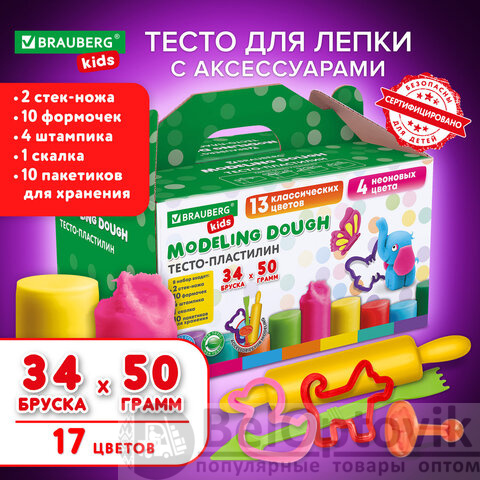 Пластилин-тесто для лепки BRAUBERG KIDS, 34 шт., 1700 г, 2 стека, 10 формочек, 4 штампика, 1 скалка, 10 пакетиков для хранения, 106723