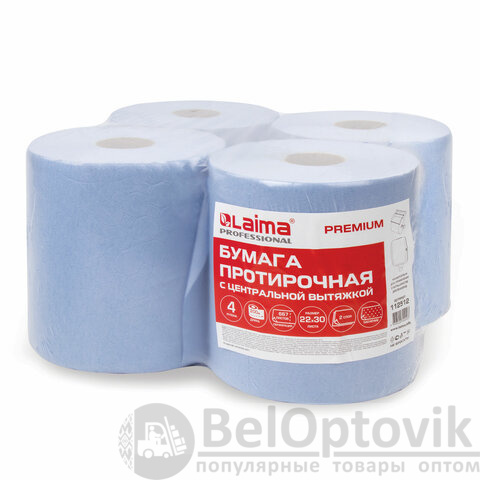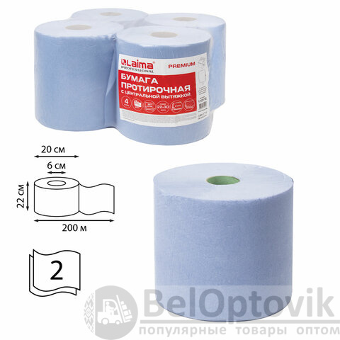 Бумага протирочная с центральной вытяжкой 200 м, LAIMA (W1/W2) PREMIUM, 2 слоя, 667 листов, размер листа 22х30 см, КОМПЛЕКТ 4 рулона, 112512