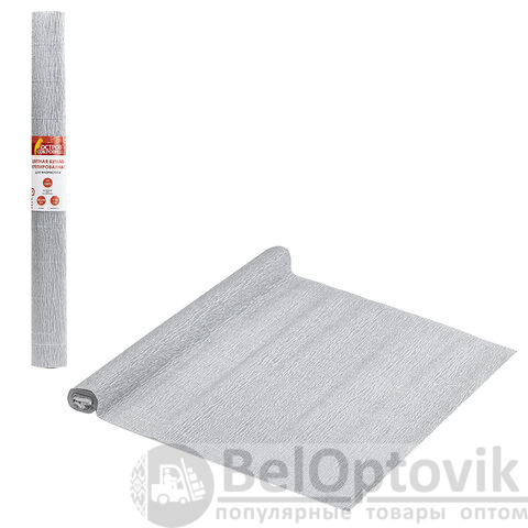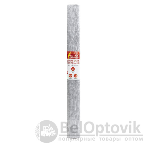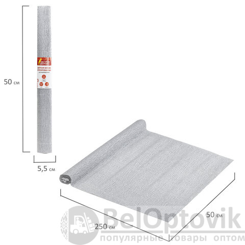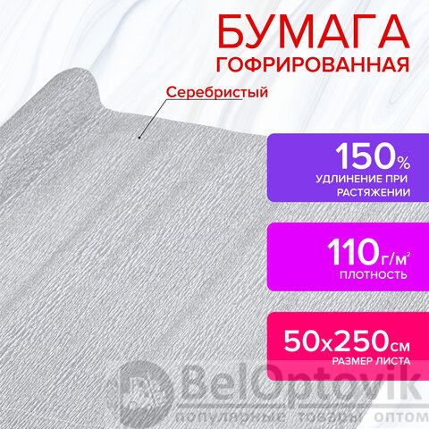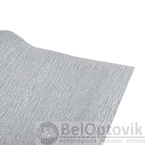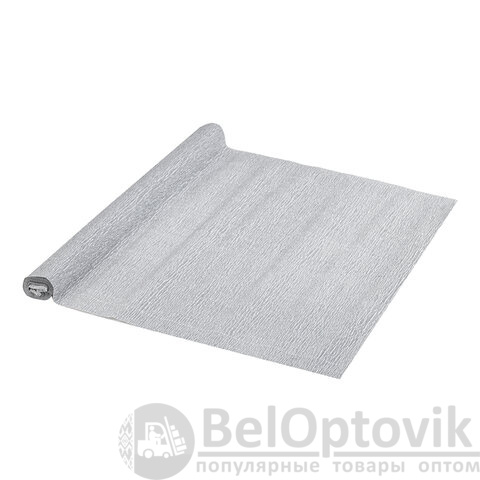 Гофрированная (креповая) бумага представляет собой бумажную продукцию с неровной, складчатой поверхностью. Размер бумаги – 50х250 см, плотность – 110 г/м2, удлинение при натяжении – 150%. Цвет - Серебристый.