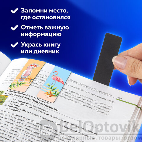 Закладки выполнены из картона и винила, надежно крепятся на листе благодаря магнитной полосе. Позволяют быстро найти нужную страницу. Удобны в применении и даже спустя большое количество времени будут выглядеть аккуратно. Размер закладки - 20х60 мм. В наборе 30 штук.