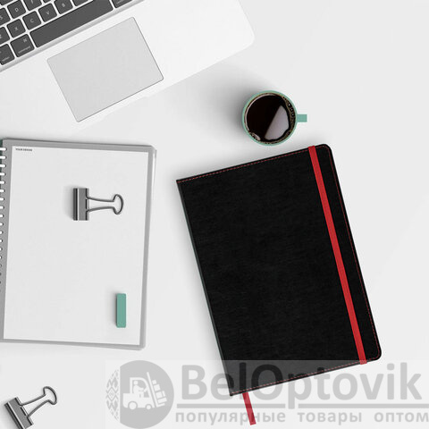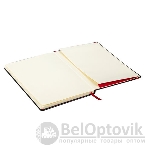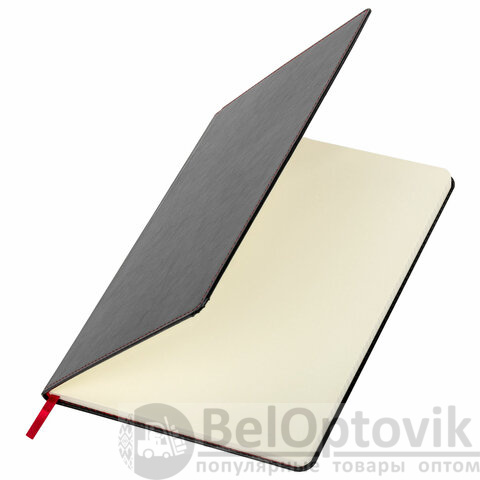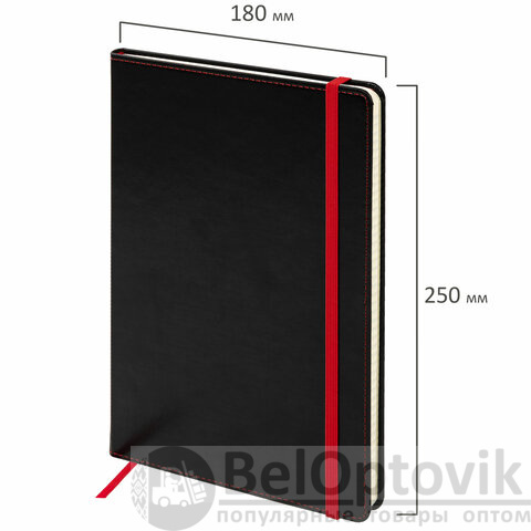 Твердая обложка стилизована под кожу черного цвета. Имеет закругленные уголки. Подходит для горячего тиснения. 80 листов позволят зафиксировать большой объем информации. Линовка блока в клетку (5х5 мм) дает возможность аккуратно заполнить цифровые значения, а также нанести чертежные зарисовки. Внутренний блок выполнен из офсета тонированного цвета плотностью 70 г/м2 и крепится к обложке с помощью книжного переплета. На внутренней стороне задней обложки есть декоративный конверт для разных мелочей в виде визиток, напоминалок и т. д. Снабжен резинкой-фиксатором, благодаря чему блокнот не откроется в сумочке или портфеле и листы не помнутся. Резинка-фиксатор и прострочка по периметру блокнота окрашены на контрасте цвета обложки, что придает блокноту изысканность и шарм. Дополнением является закладка-ляссе, с помощью которой при необходимости можно быстро открыть нужную страницу. Формат блокнота В5 (180х250 мм).