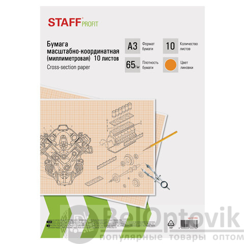 Бумага формата А3 (297х420 мм) и плотностью 65 г/м2. Упакована в картонную папку по 10 листов. Цвет линовки - оранжевый. Отличается четкими линиями и точной миллиметровой разметкой.