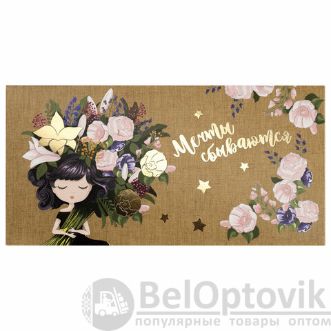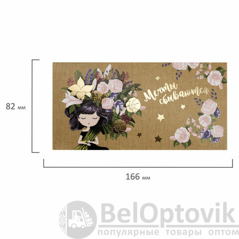 Конверт с надписью "МЕЧТЫ СБЫВАЮТСЯ" изготовлен из высококачественного картона плотностью 215 г/м2. Выполнен в бежевом цвете с изображением девушки и цветочным принтом. Отделка - фольга. Размер - 166х82 мм.