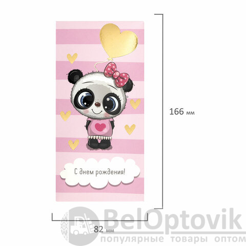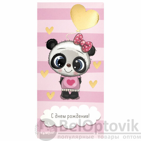 Конверт для денег "С ДНЁМ РОЖДЕНИЯ!", Панда, розовый, 166х82 мм, фольга, ЗОЛОТАЯ СКАЗКА, 113762