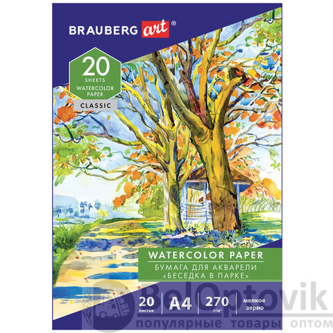 Папка для акварели А4, 20 л., 270 г/м2, мелкое зерно, BRAUBERG ART CLASSIC, "Беседка в парке", 114398