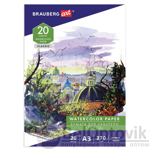 Папка для акварели БОЛЬШАЯ А3, 20 л., 270 г/м2, мелкое зерно, BRAUBERG ART CLASSIC, "Город", 114400