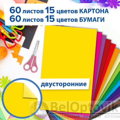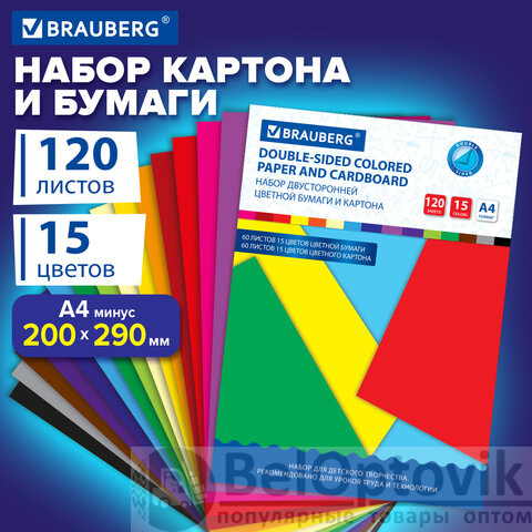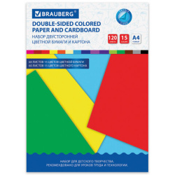 Набор цветного картона и бумаги А4 ТОНИРОВАННЫХ В МАССЕ, 60+60 л., 15 цв., BRAUBERG, "Творчество", 115088