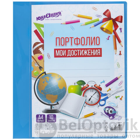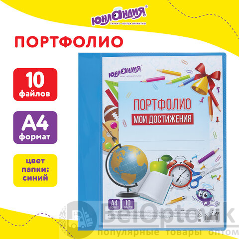 Папка для портфолио школьника/дошкольника, А4, 2 кольца, 10 файлов, пластик синий, ЮНЛАНДИЯ, 115236