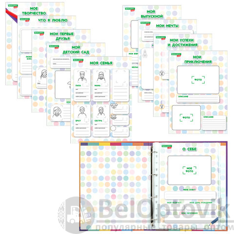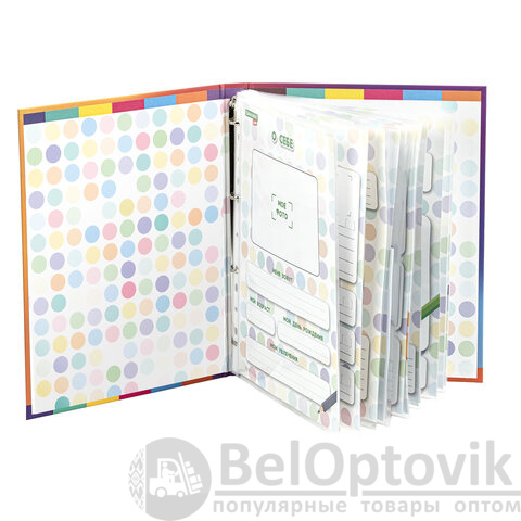 Также в комплект входят 10 вкладышей из плотной мелованной бумаги плотностью 115 г/м2 с разными рубриками:
