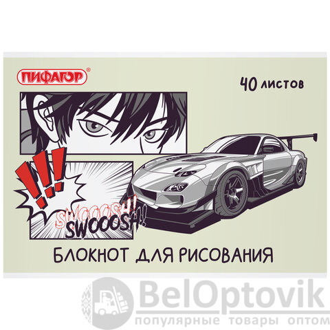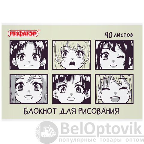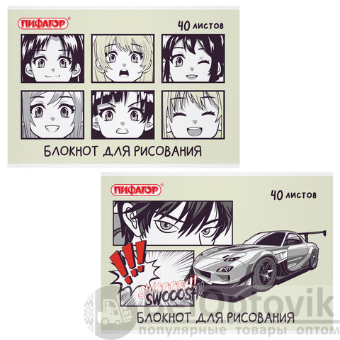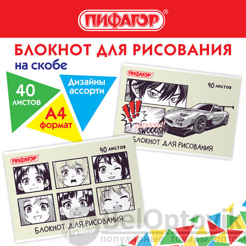 Блокнот для рисования, А4, 40 листов, скоба, обложка офсет, ПИФАГОР, 200х285 мм, "Аниме" (2 вида), 115247